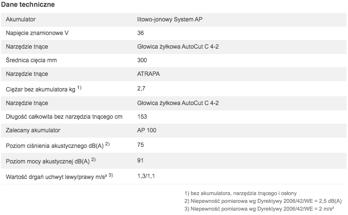 bez akumulatora i ładowarki Opis Parametry Akumulator litowo-jonowy System AP Narzędzie tnące Głowica żyłkowa AutoCut C 4-2 Narzędzie tnące Głowica żyłkowa AutoCut C 4-2 Zobacz również inne: ImageNameCiężarMocPoj. skok.Plecakowa kosa spal. FR 410 C-E10,8kg2,0/2,7kW/KM41,6cm3Kosa spalinowa FS 2356,8kg1,55/2,1kW/KM36,3cm3Kosa spalinowa FS 915,8kg0,95/1,3kW/KM28,4cm3<< wróć do listy